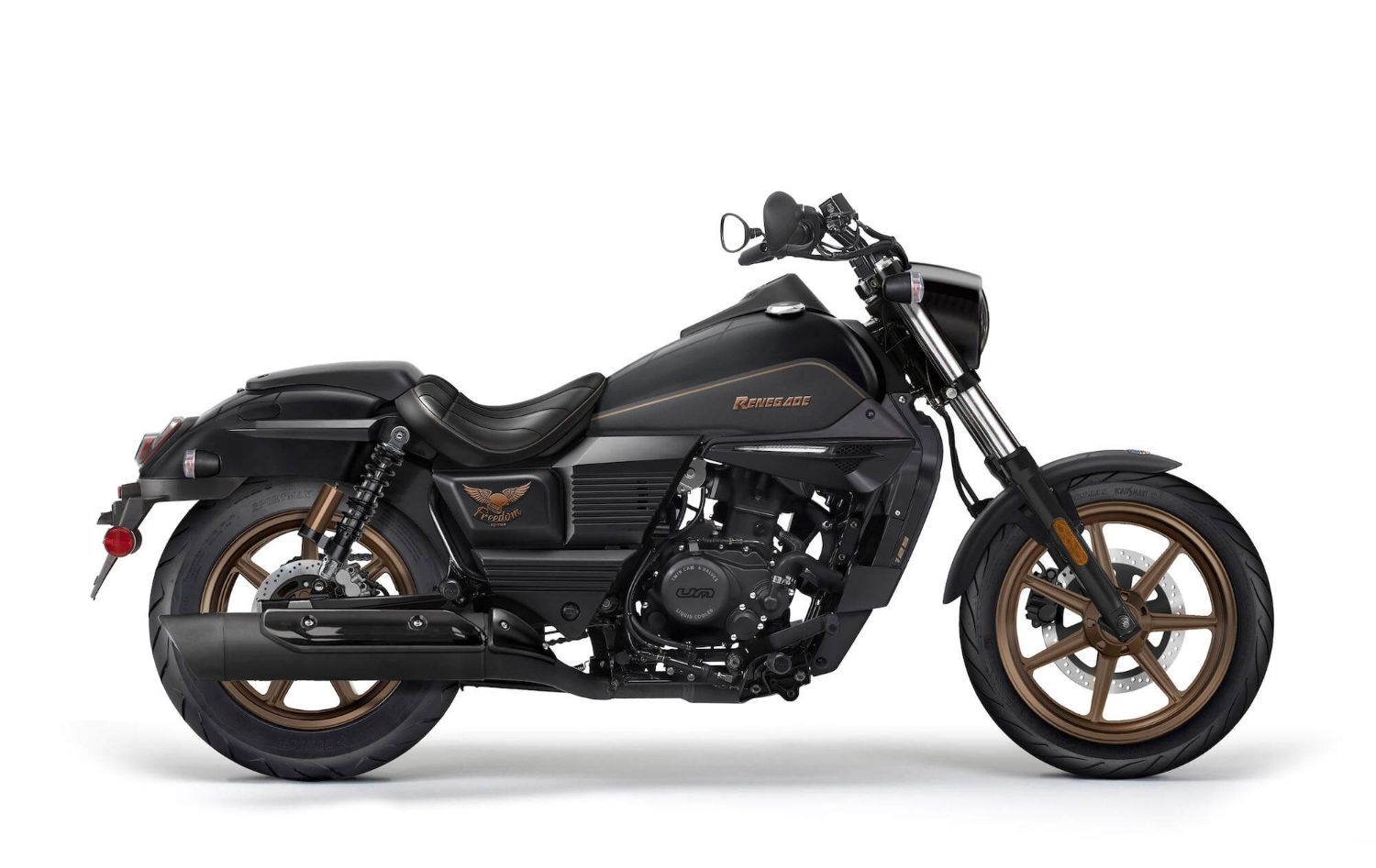 Explore the open road with the Renegade Freedom 125 cruiser from UM Motorcycles. This user-friendly 125cc cruiser has a low seat height and low centre of gravity which makes it very easy to use for new and less experienced riders. The styling is unmistakably inspired by classic cruisers, but with some sleek modern touches to create a strong and unique visual identity.
