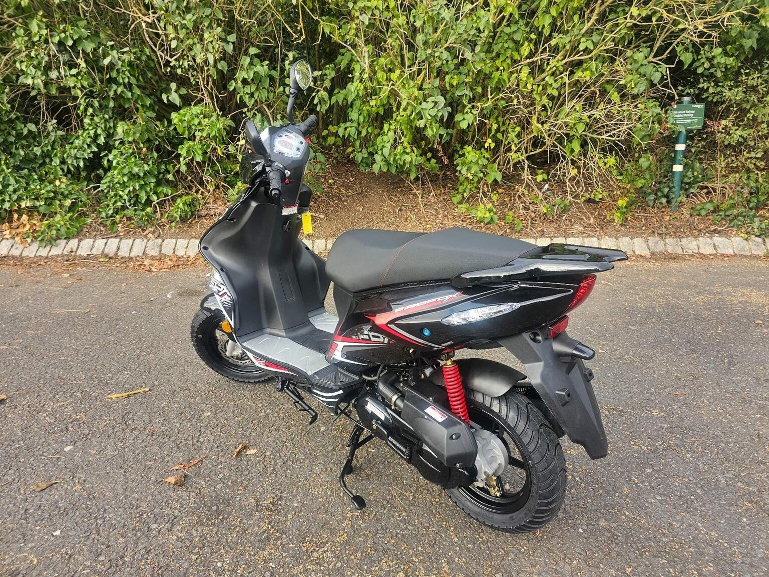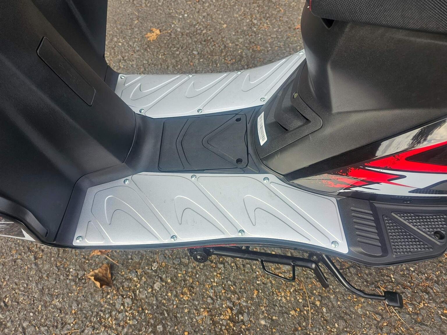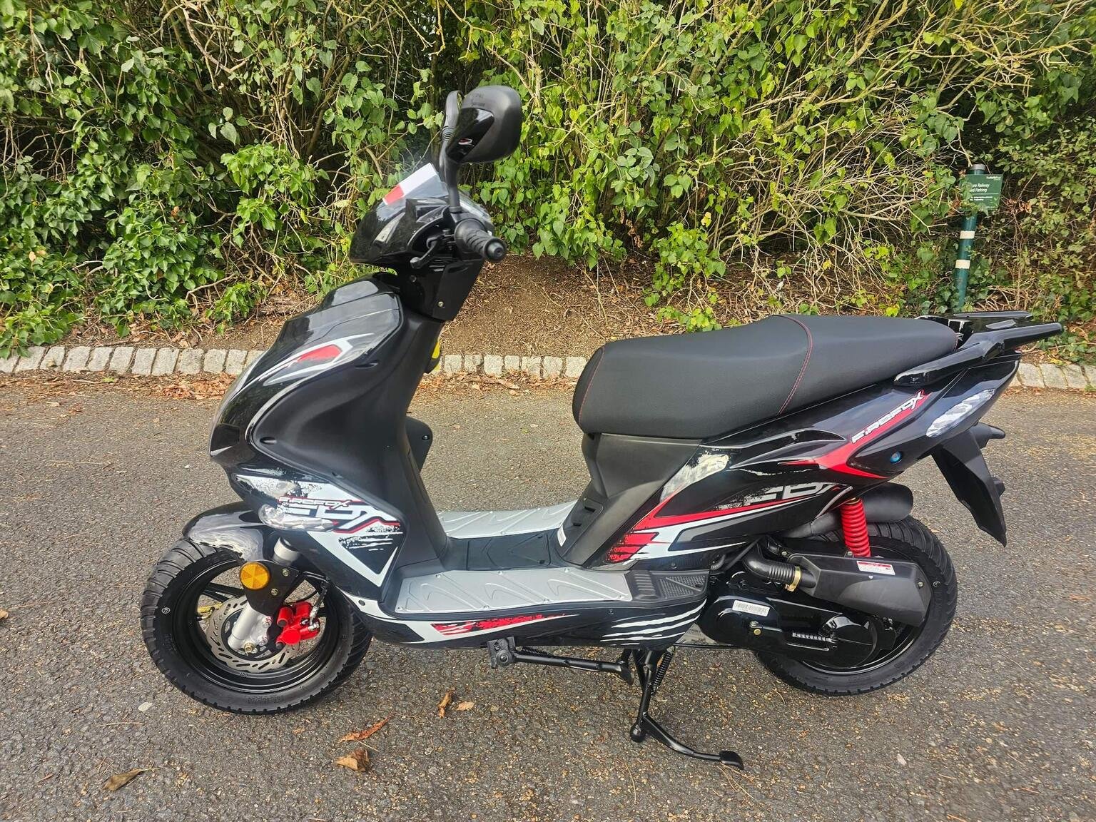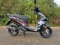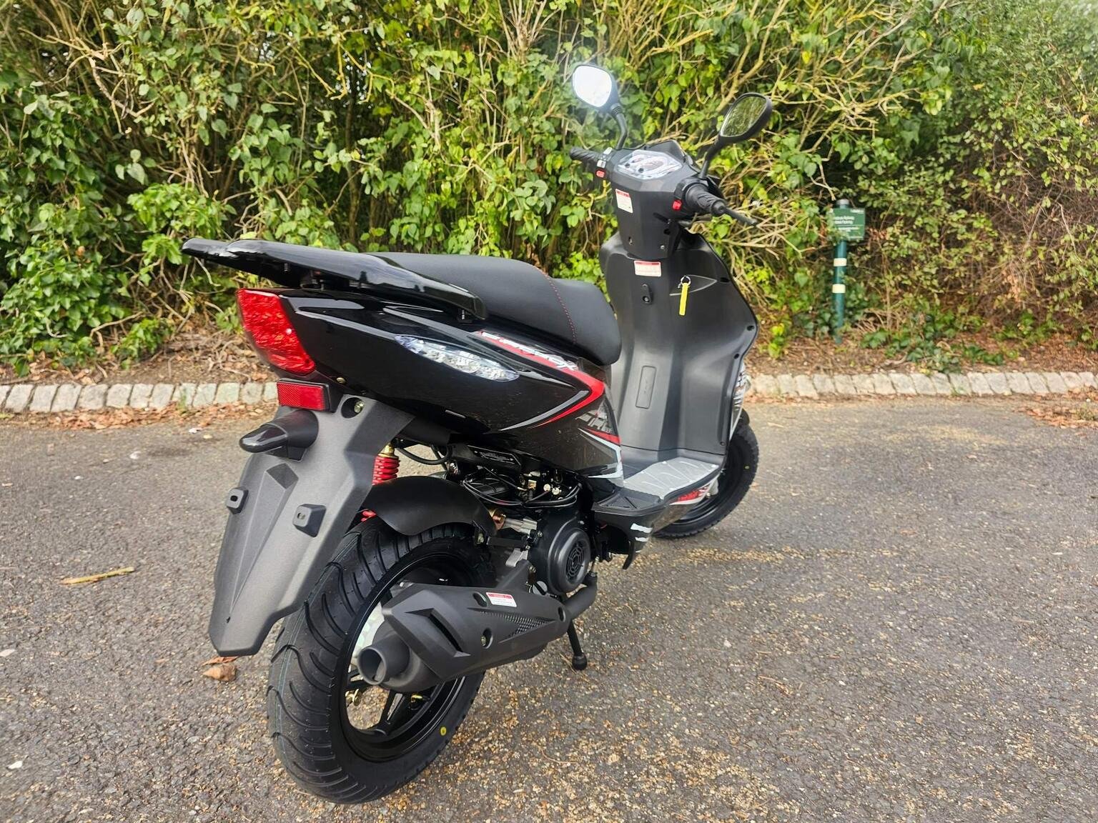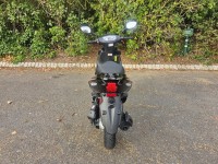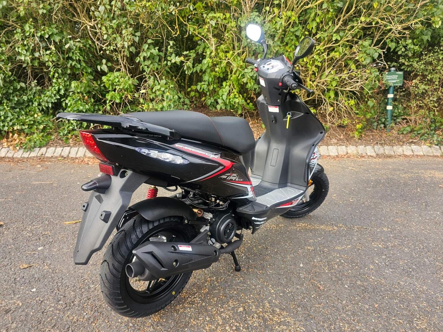 Standard equipment includes, under seat storage, rear luggage rack which will accept our optional Luggage Box, mirrors, dual marked speedometer, a fuel gauge and aluminium foot boards.