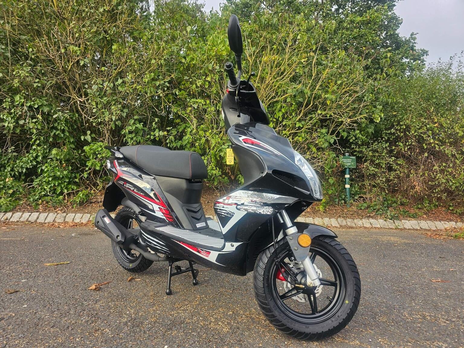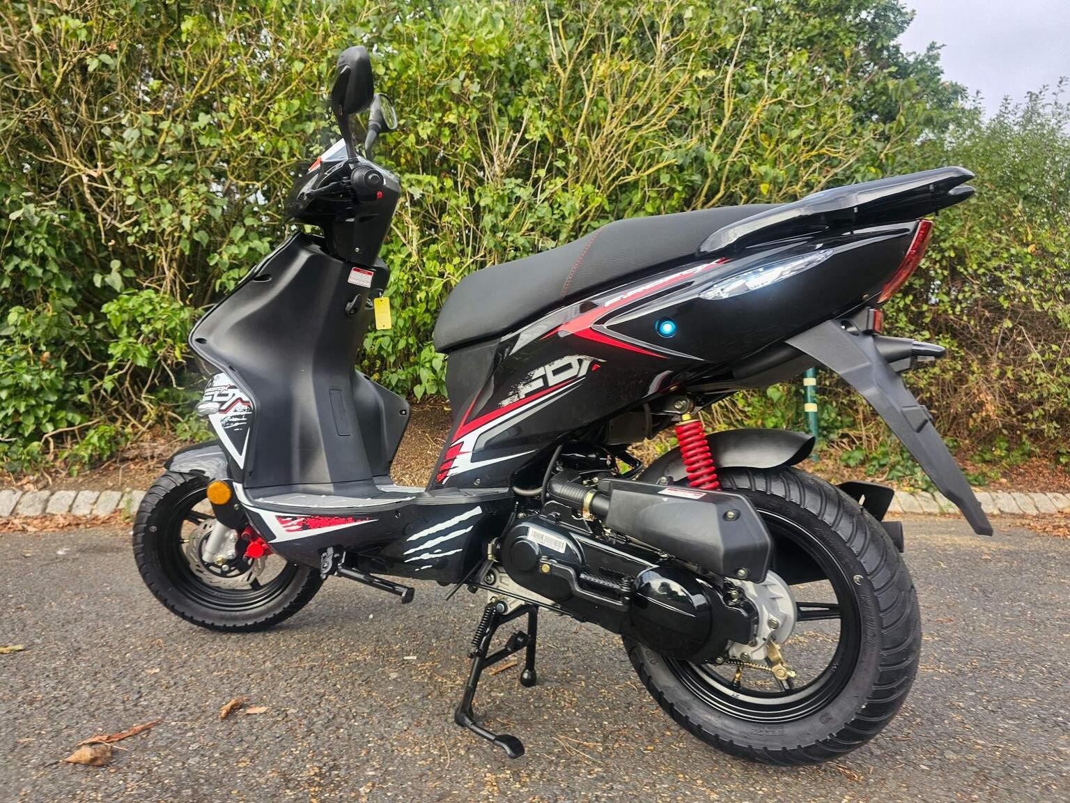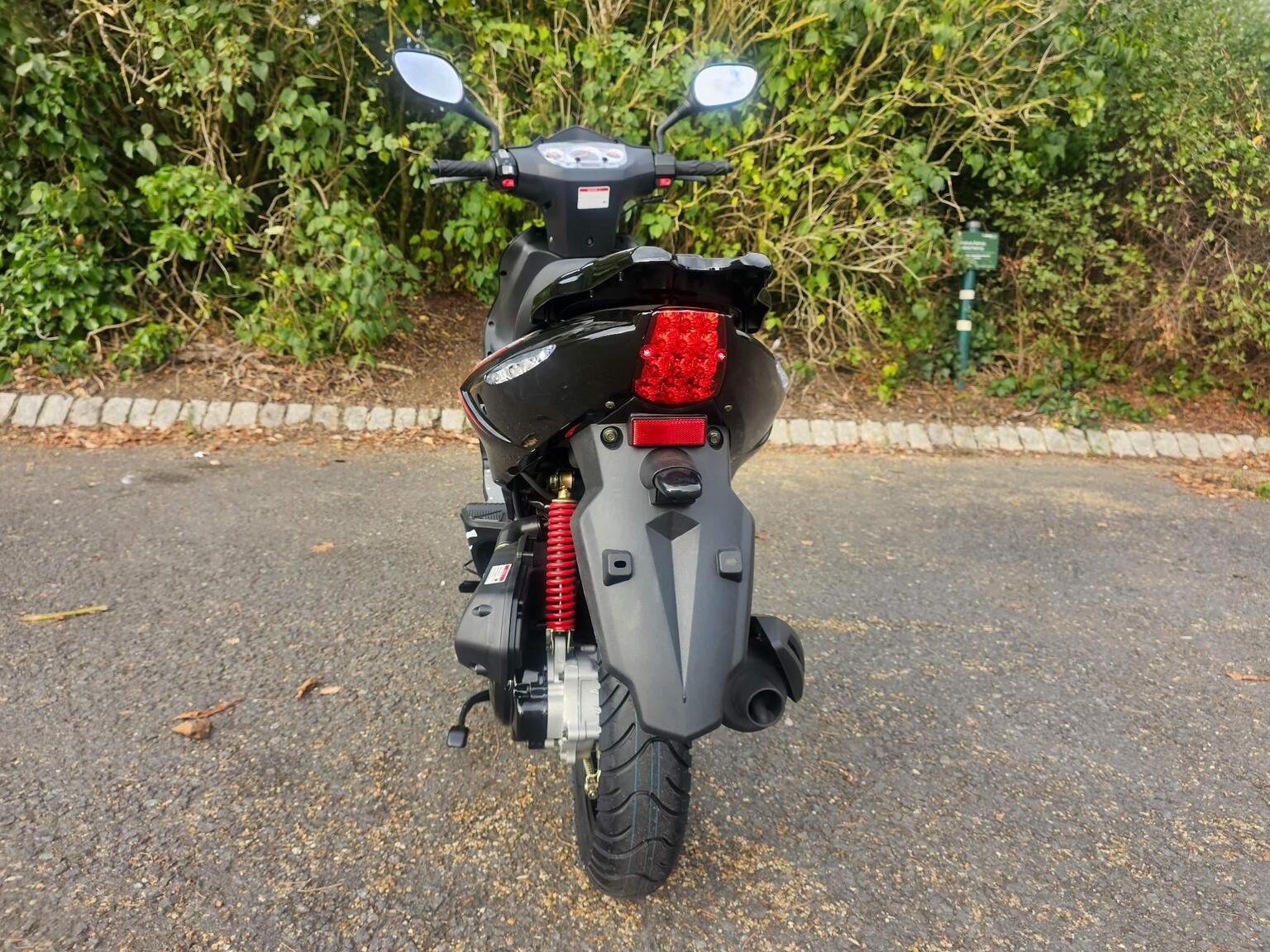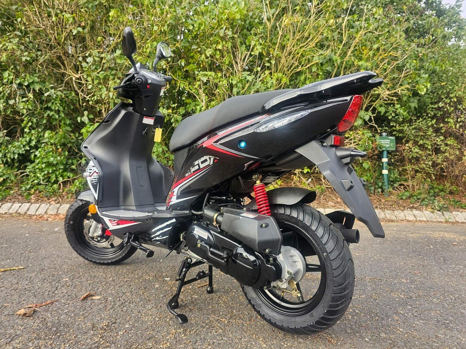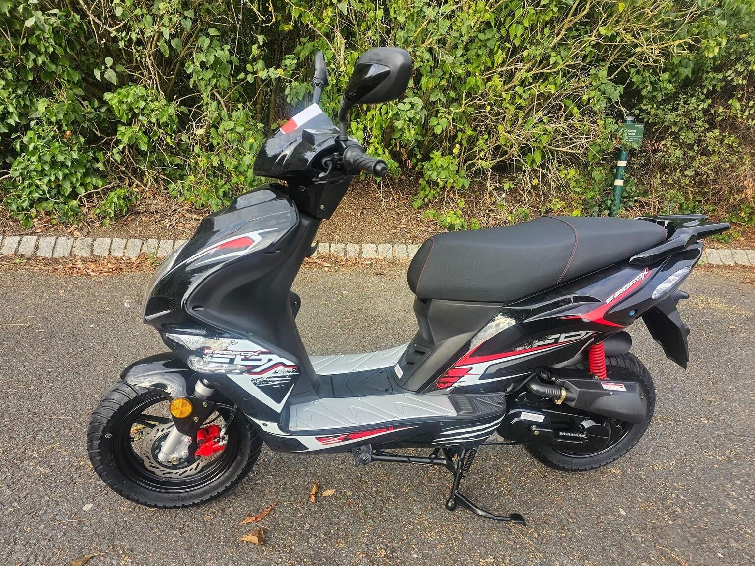 Standard equipment includes, under seat storage, rear luggage rack which will accept our optional Luggage Box, mirrors, dual marked speedometer, a fuel gauge and aluminium foot boards.