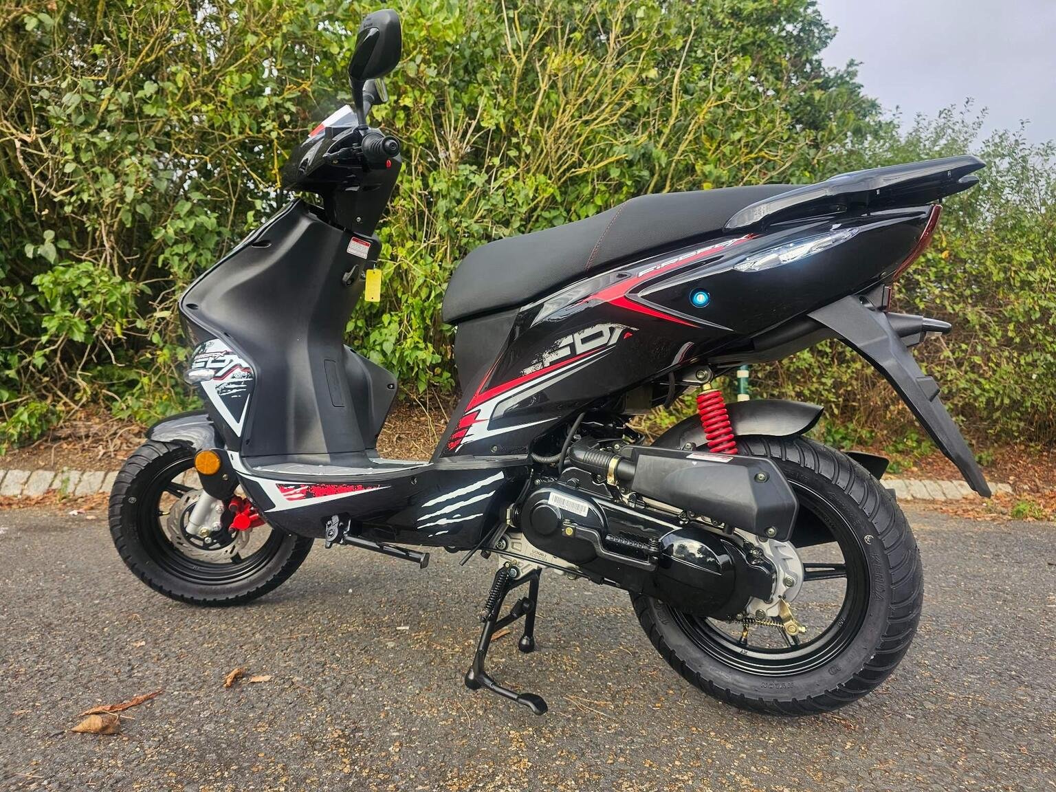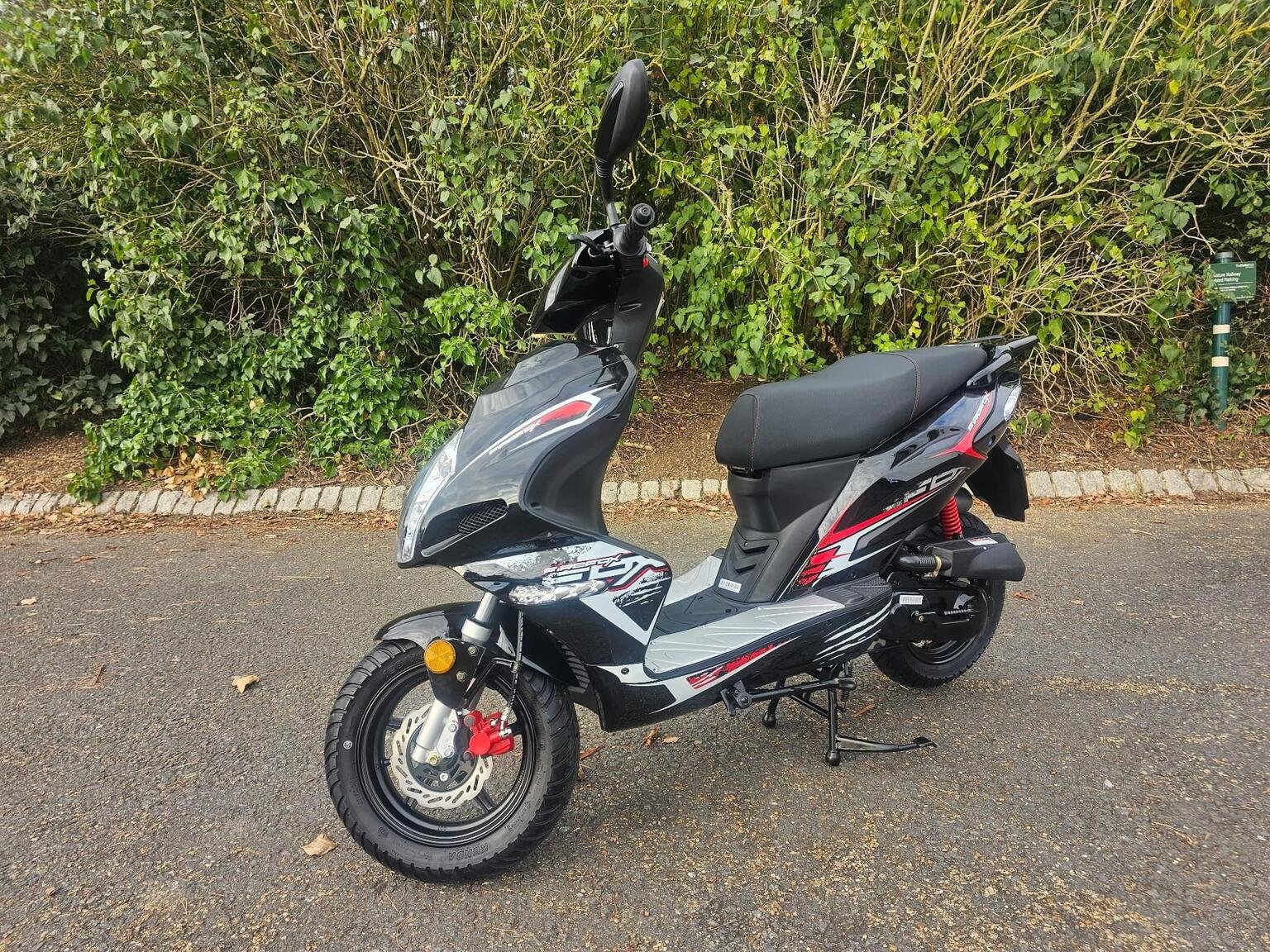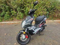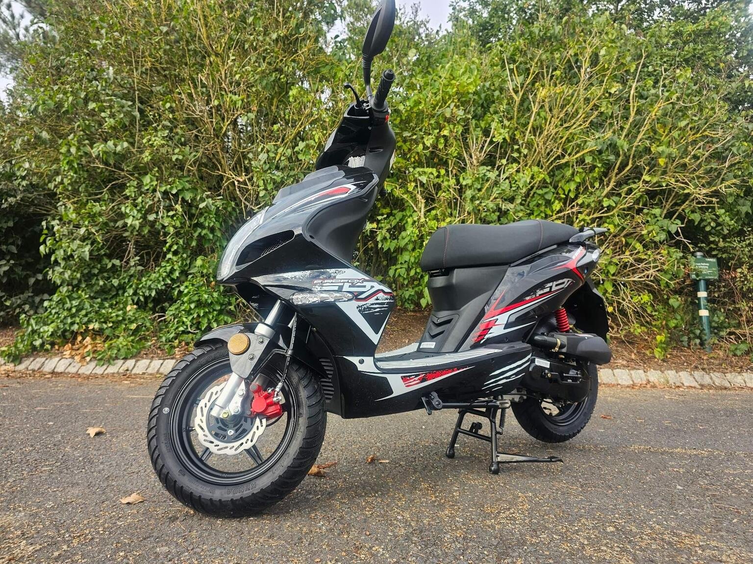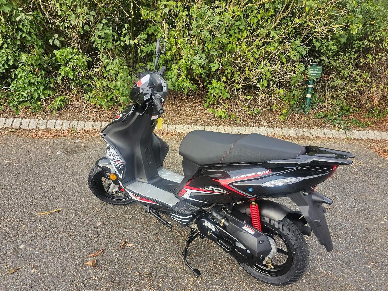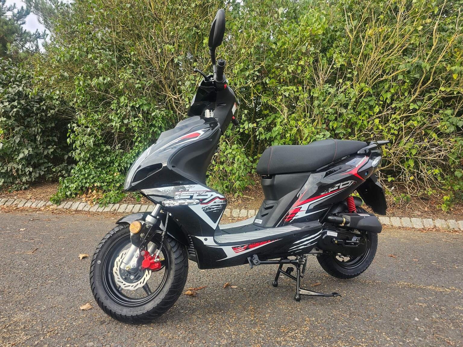 Standard equipment includes, under seat storage, rear luggage rack which will accept our optional Luggage Box, mirrors, dual marked speedometer, a fuel gauge and aluminium foot boards.