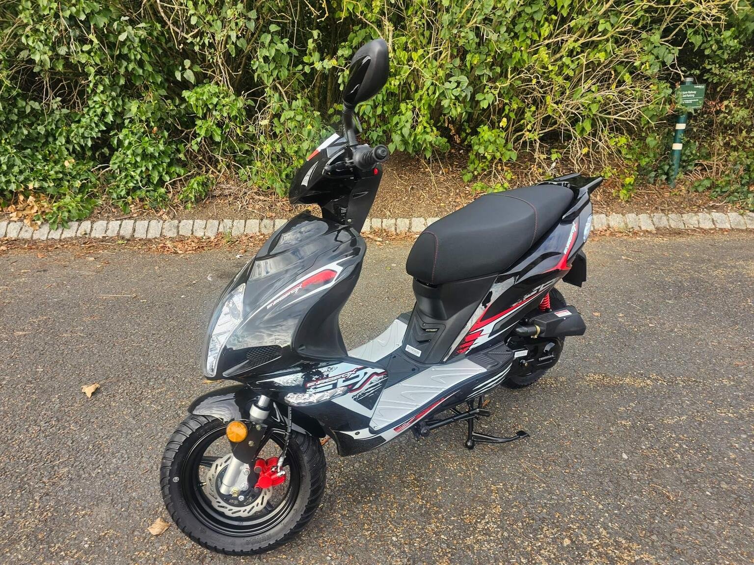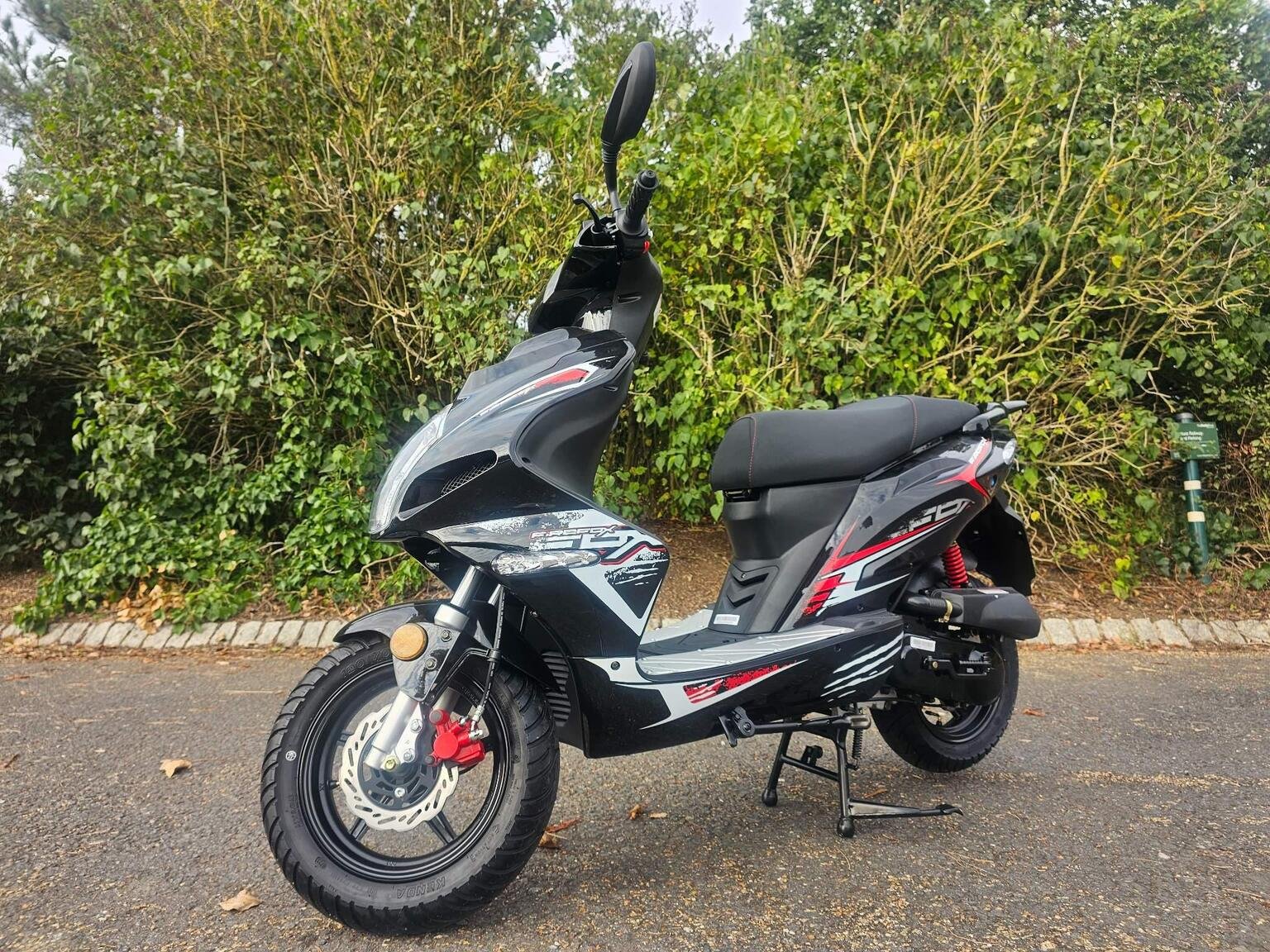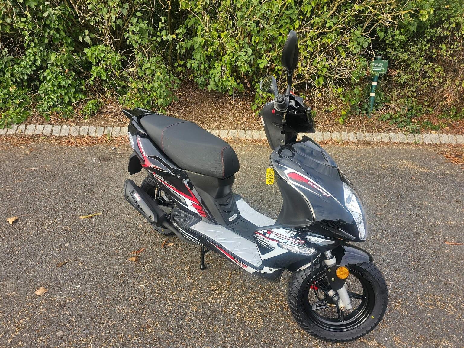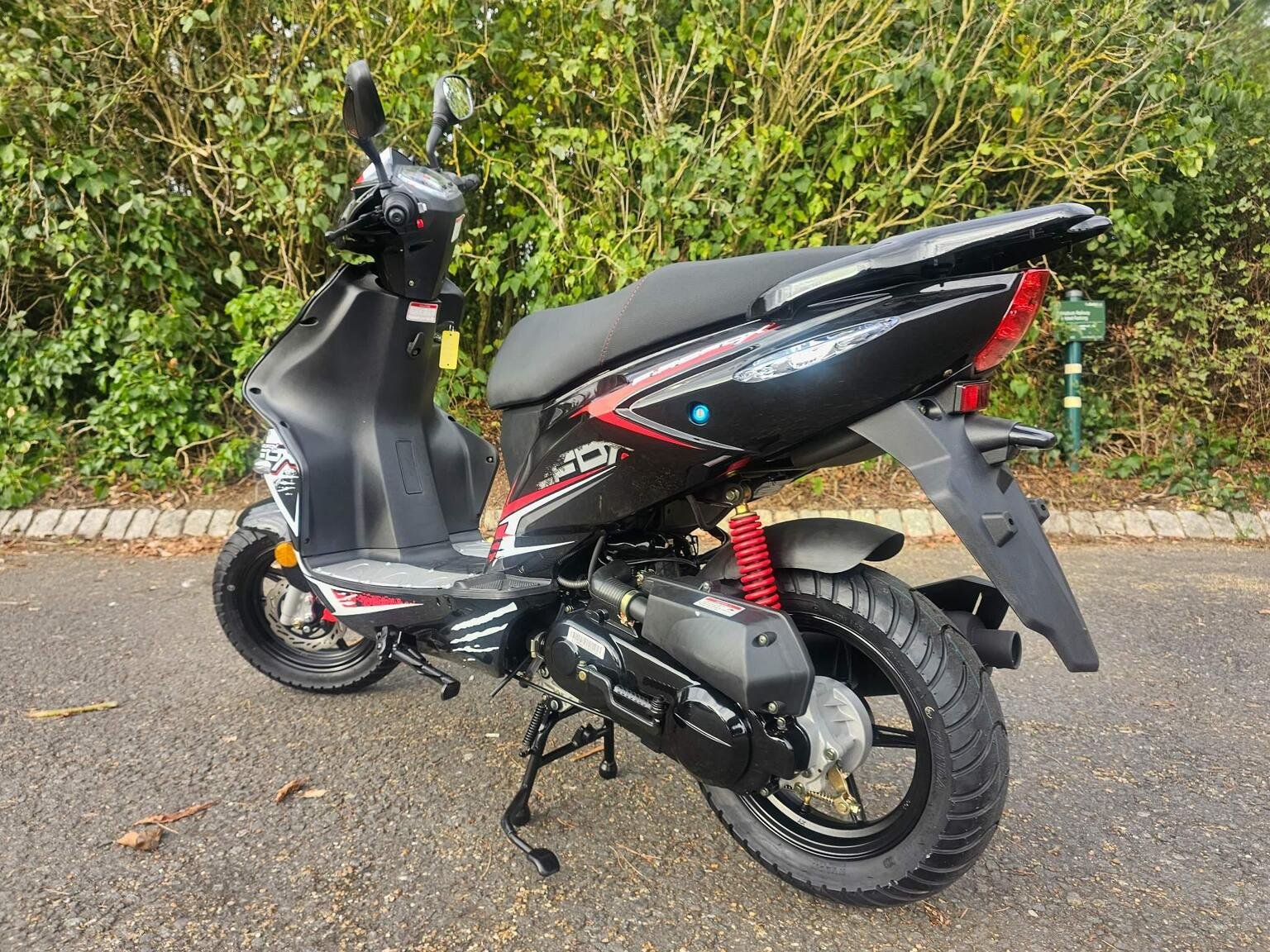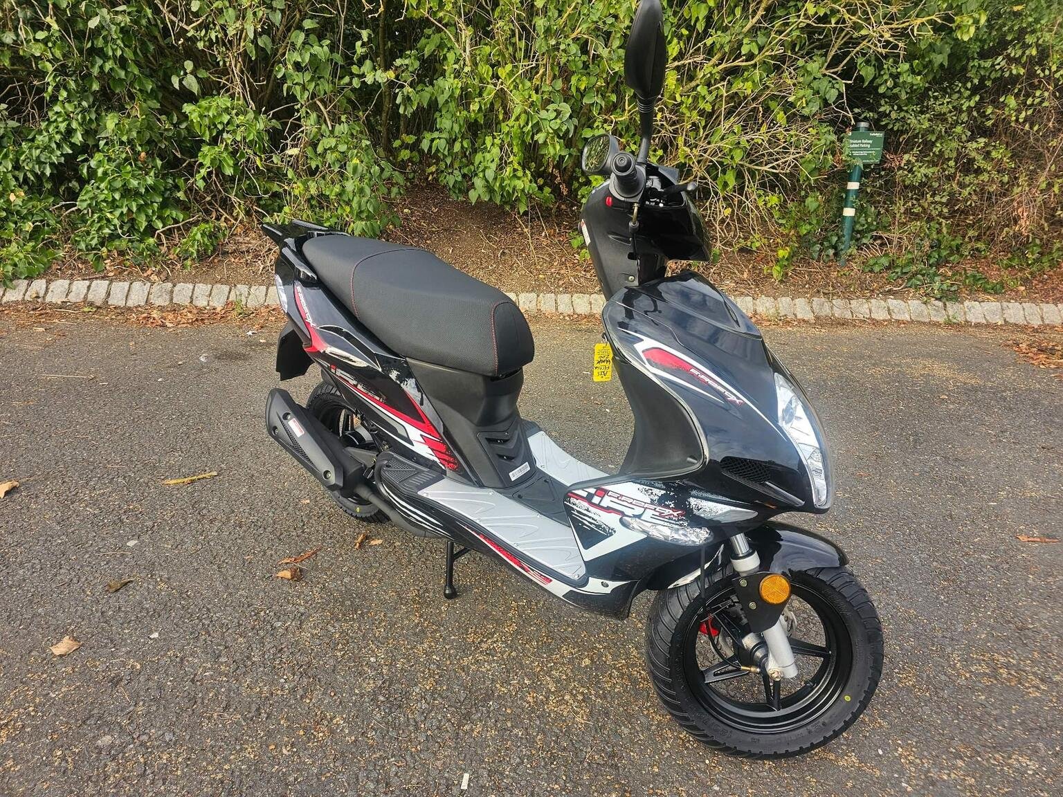 Standard equipment includes, under seat storage, rear luggage rack which will accept our optional Luggage Box, mirrors, dual marked speedometer, a fuel gauge and aluminium foot boards.