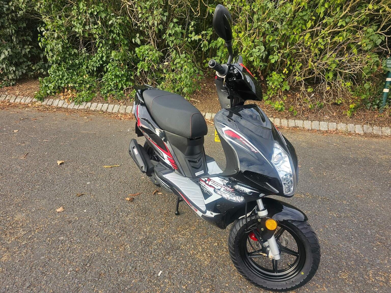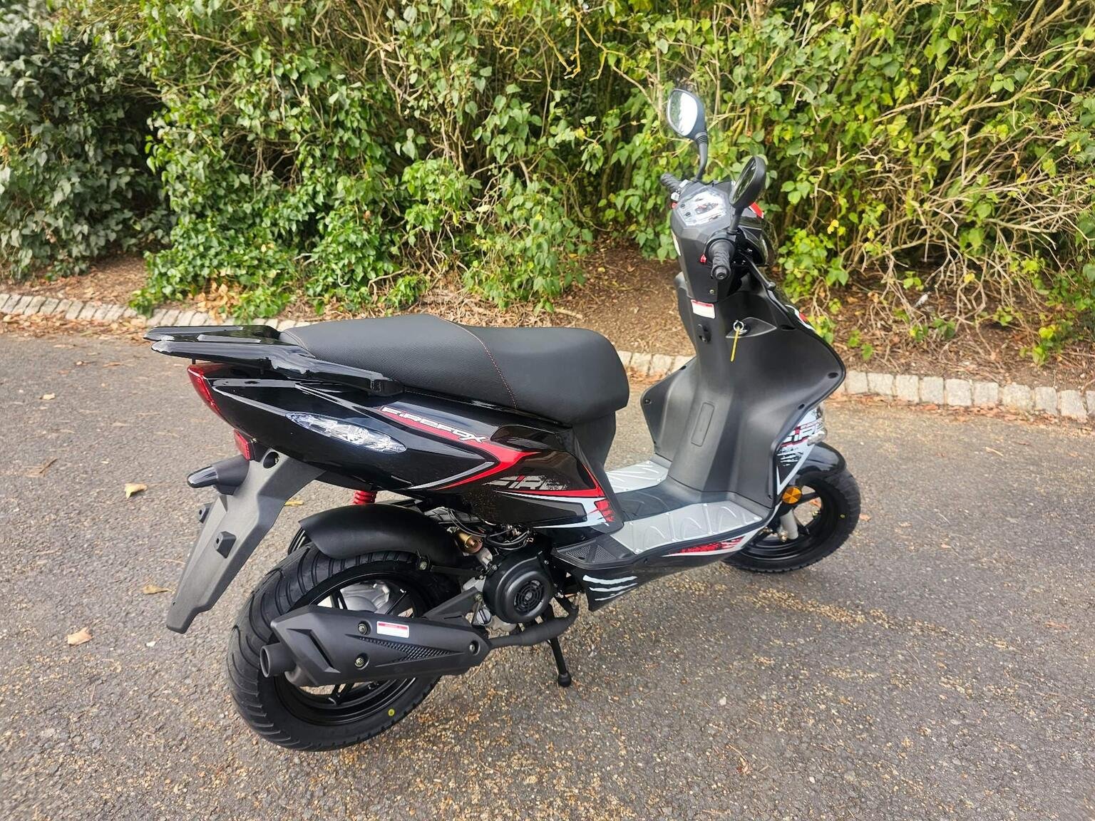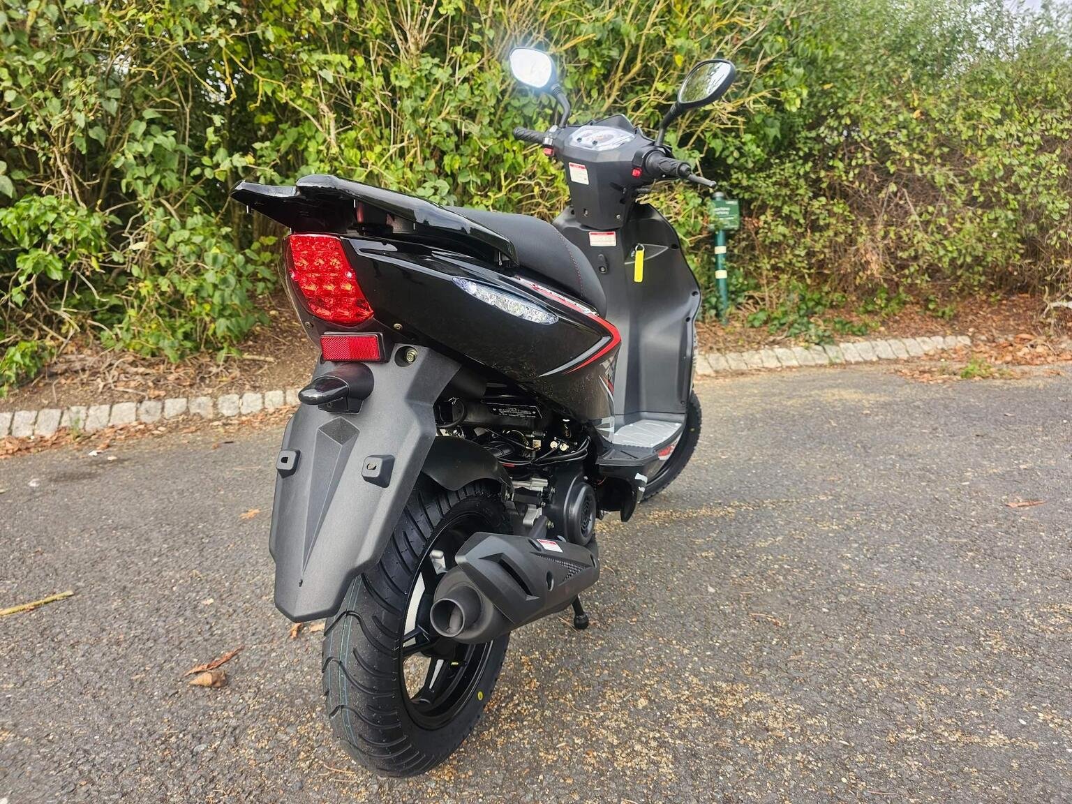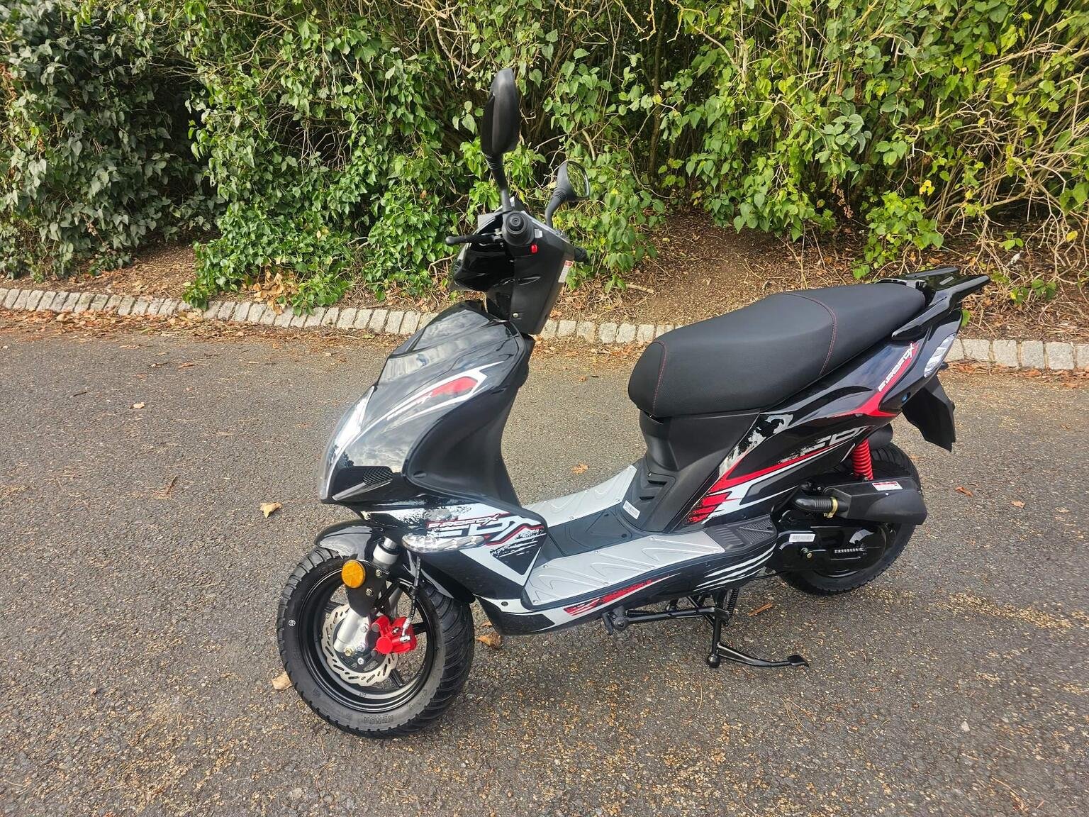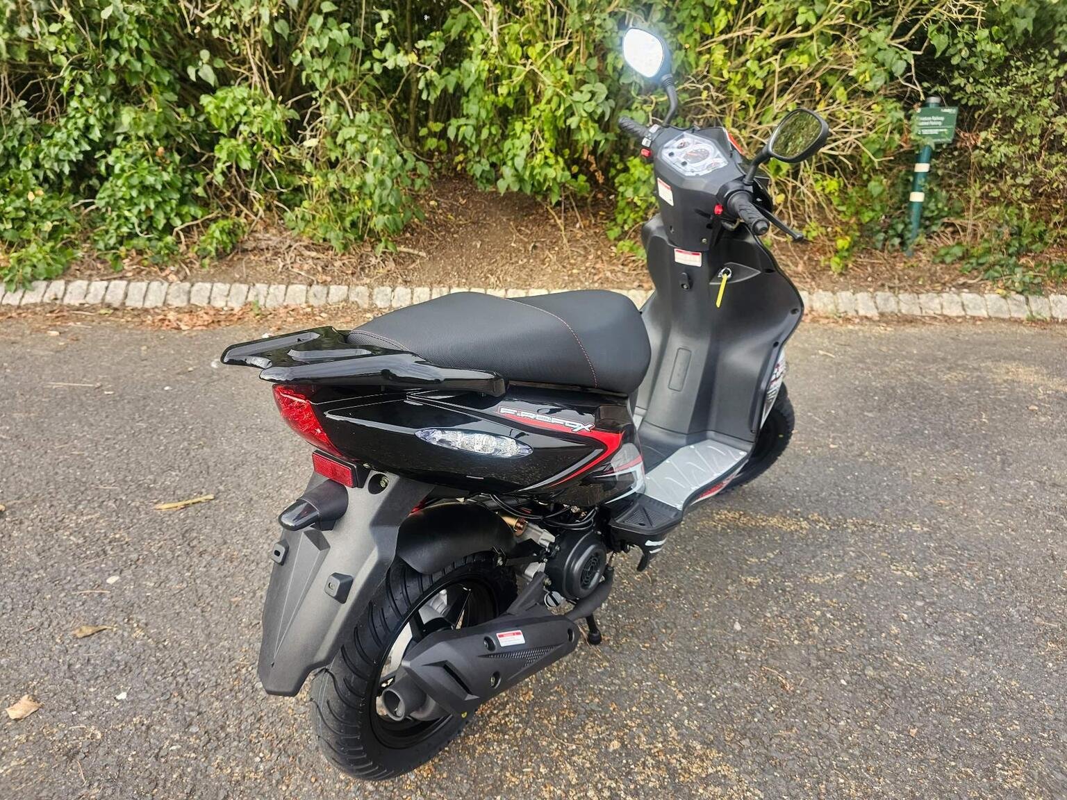 Standard equipment includes, under seat storage, rear luggage rack which will accept our optional Luggage Box, mirrors, dual marked speedometer, a fuel gauge and aluminium foot boards.