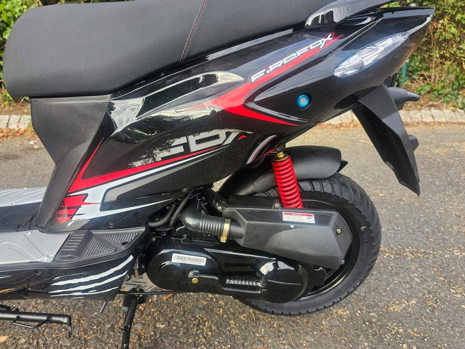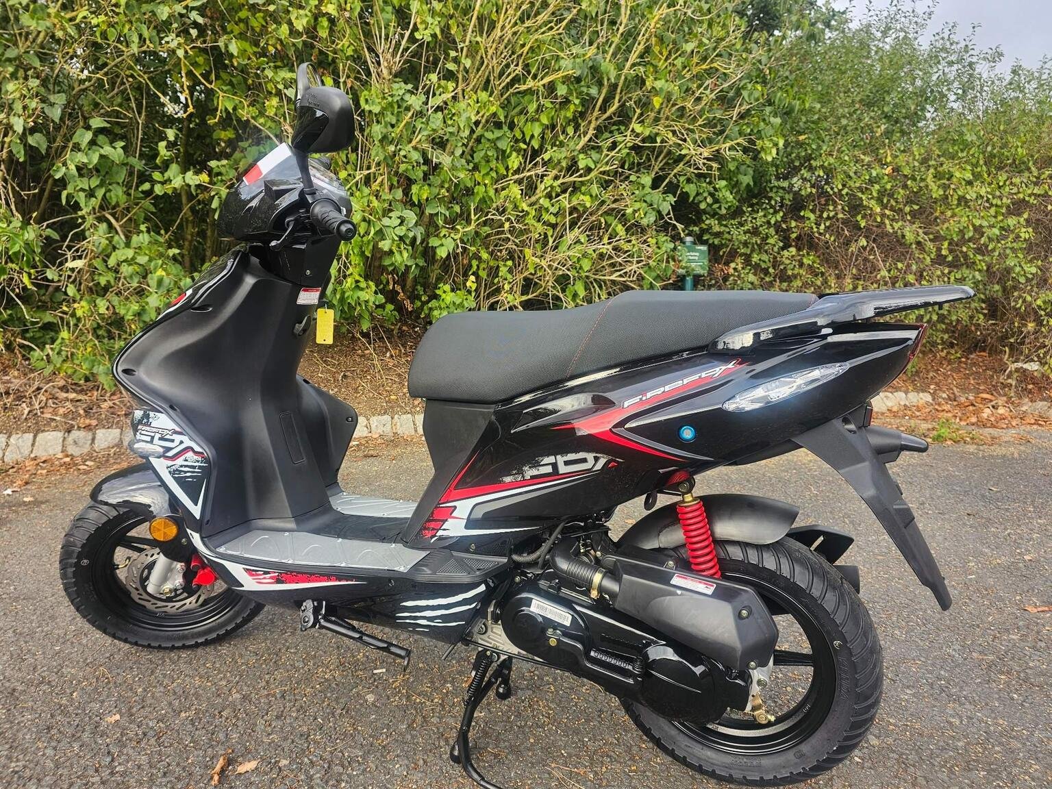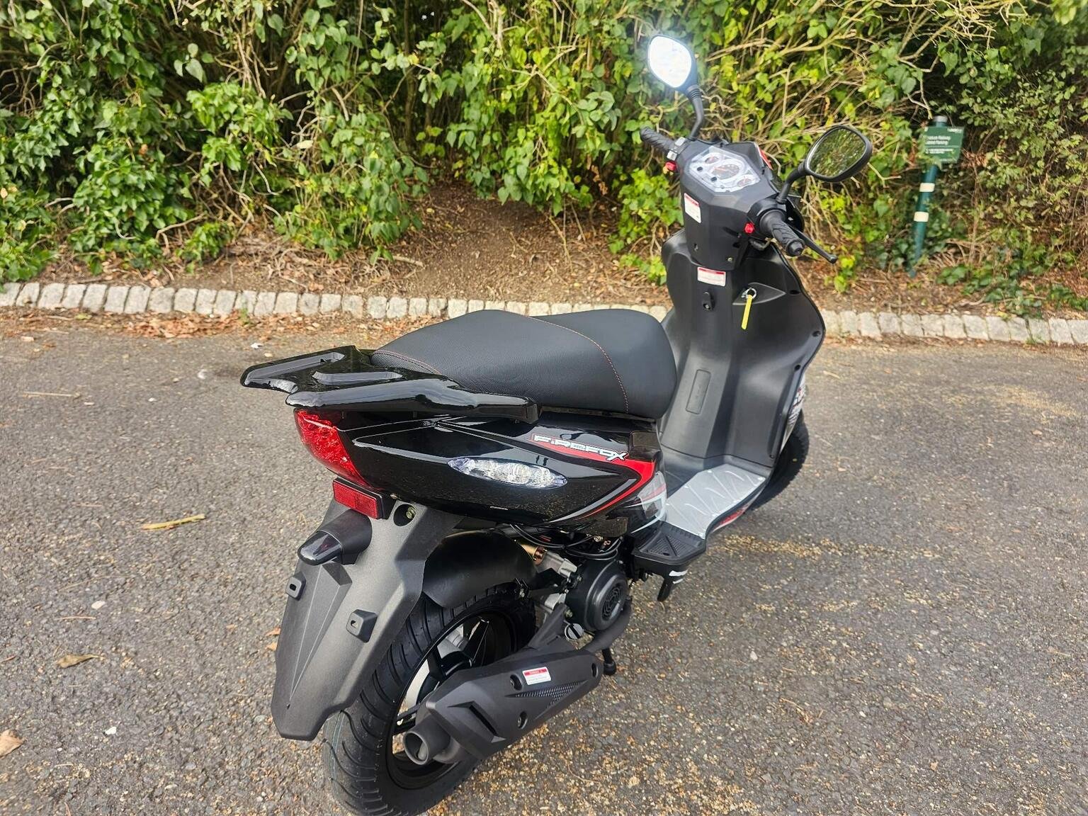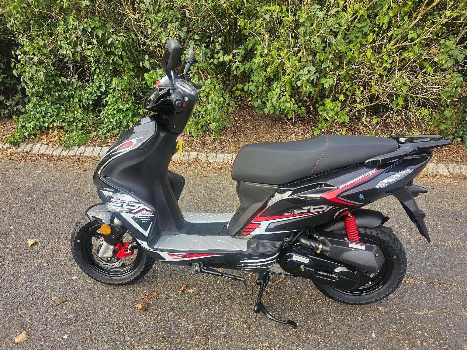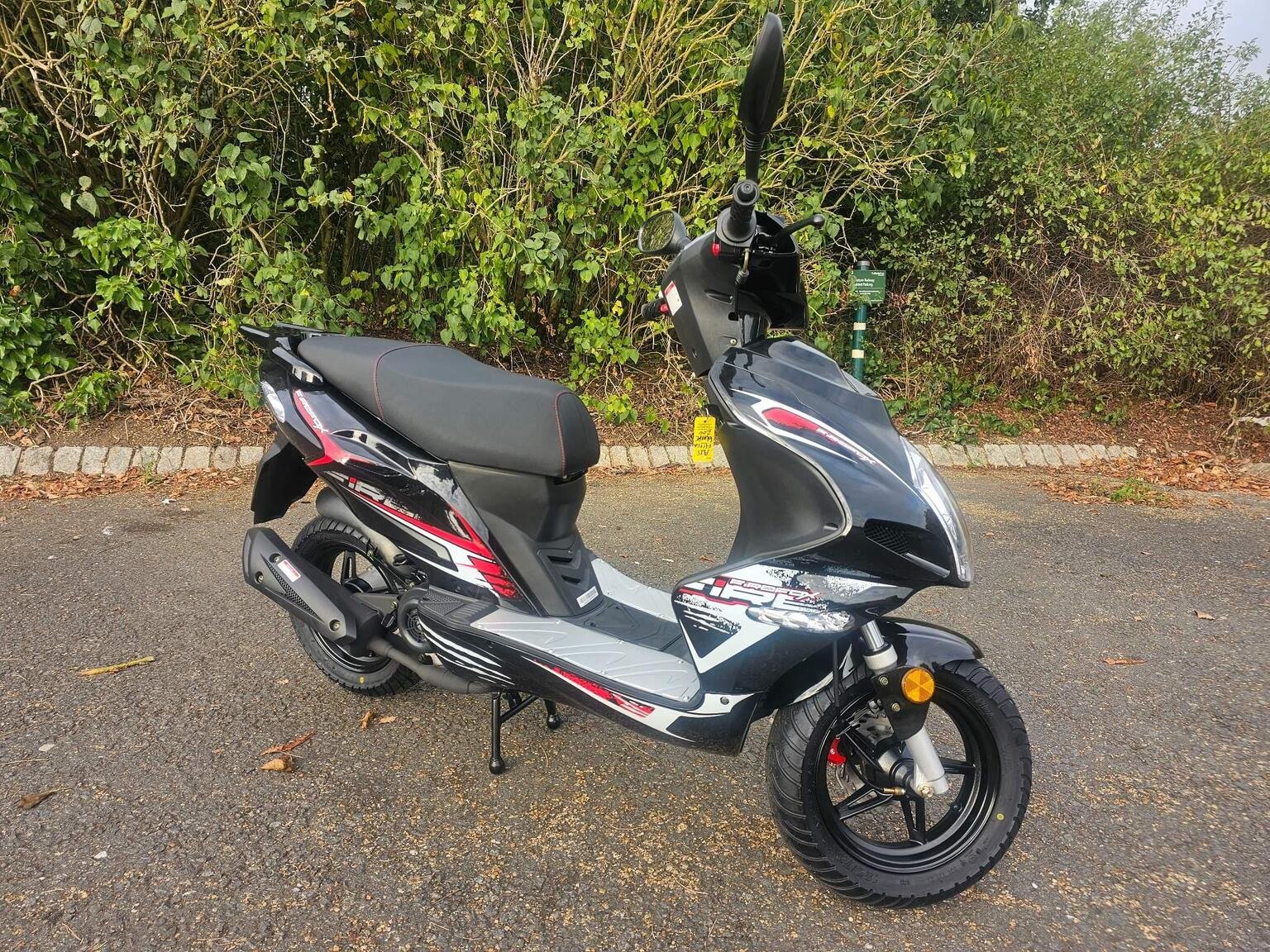 Standard equipment includes, under seat storage, rear luggage rack which will accept our optional Luggage Box, mirrors, dual marked speedometer, a fuel gauge and aluminium foot boards.