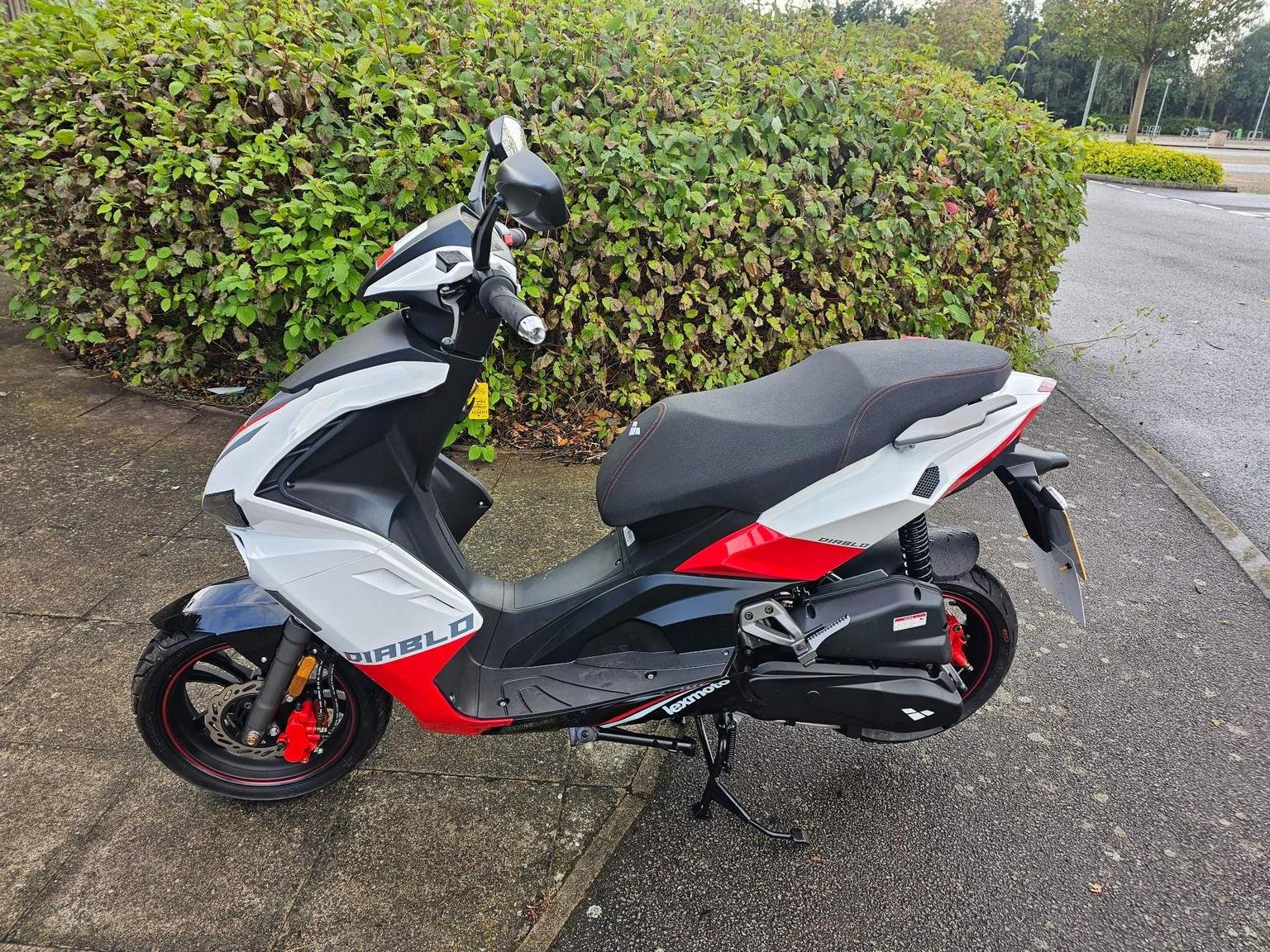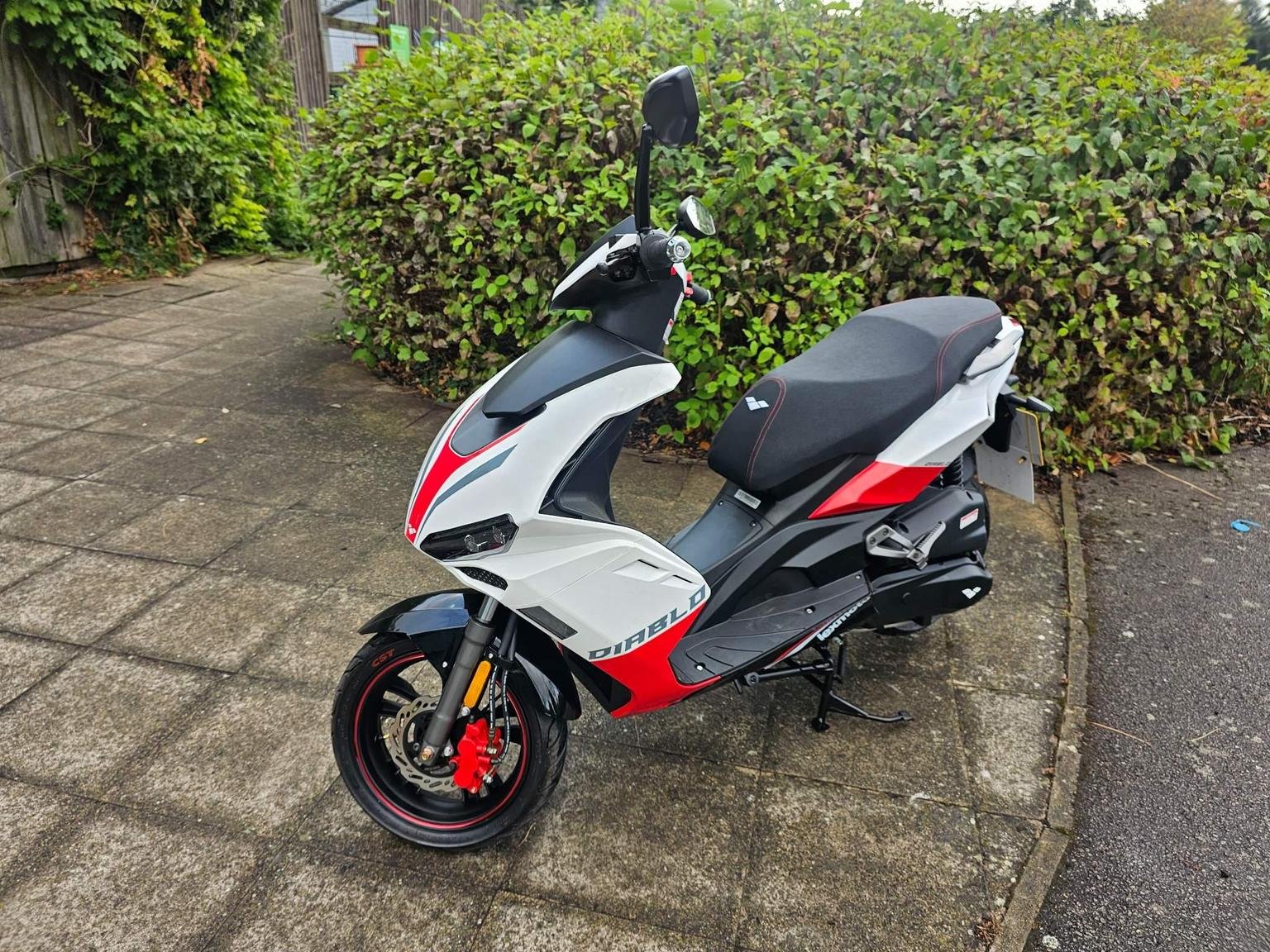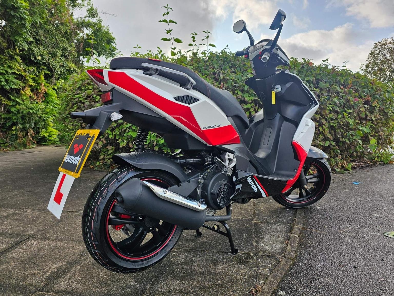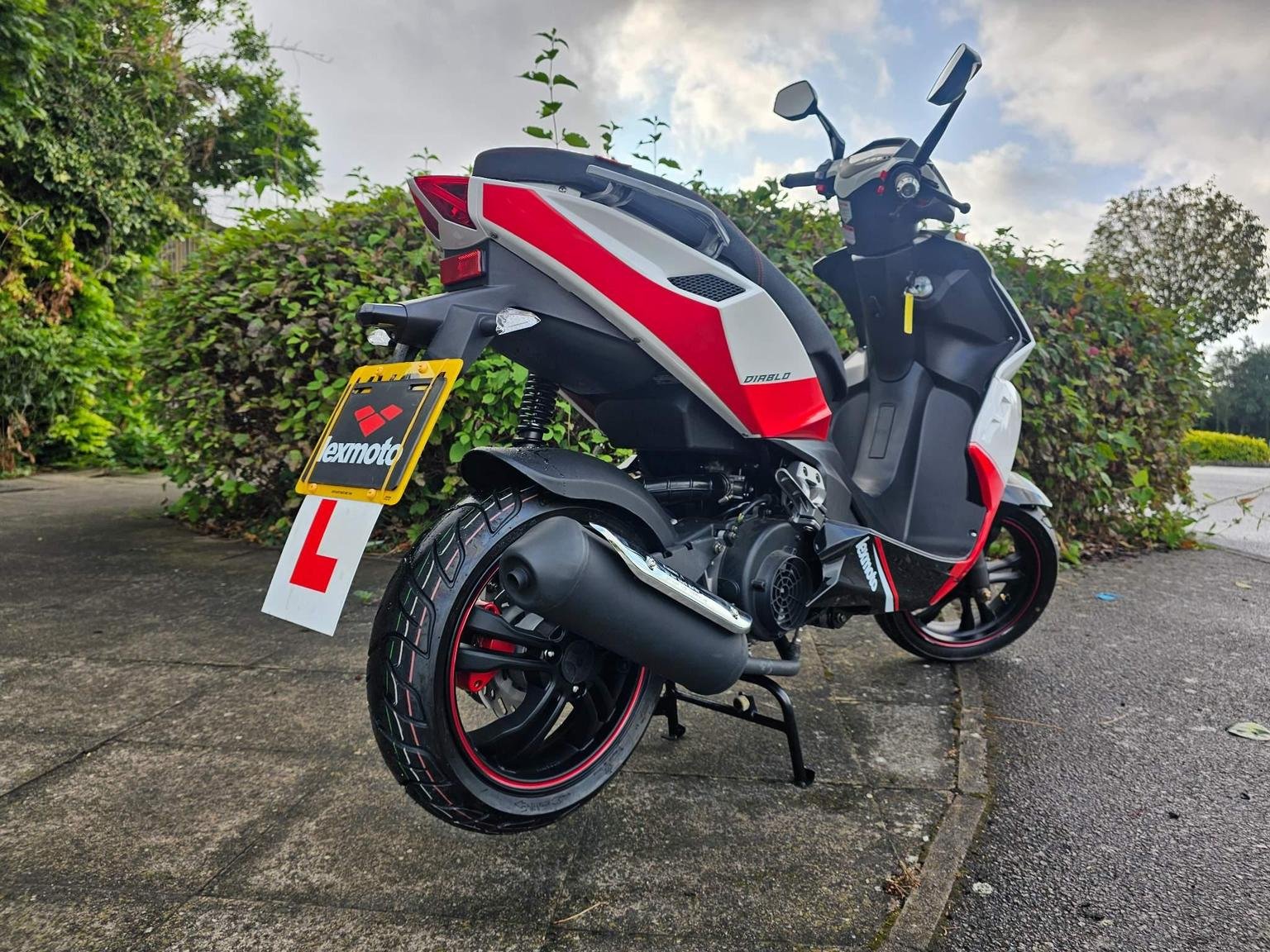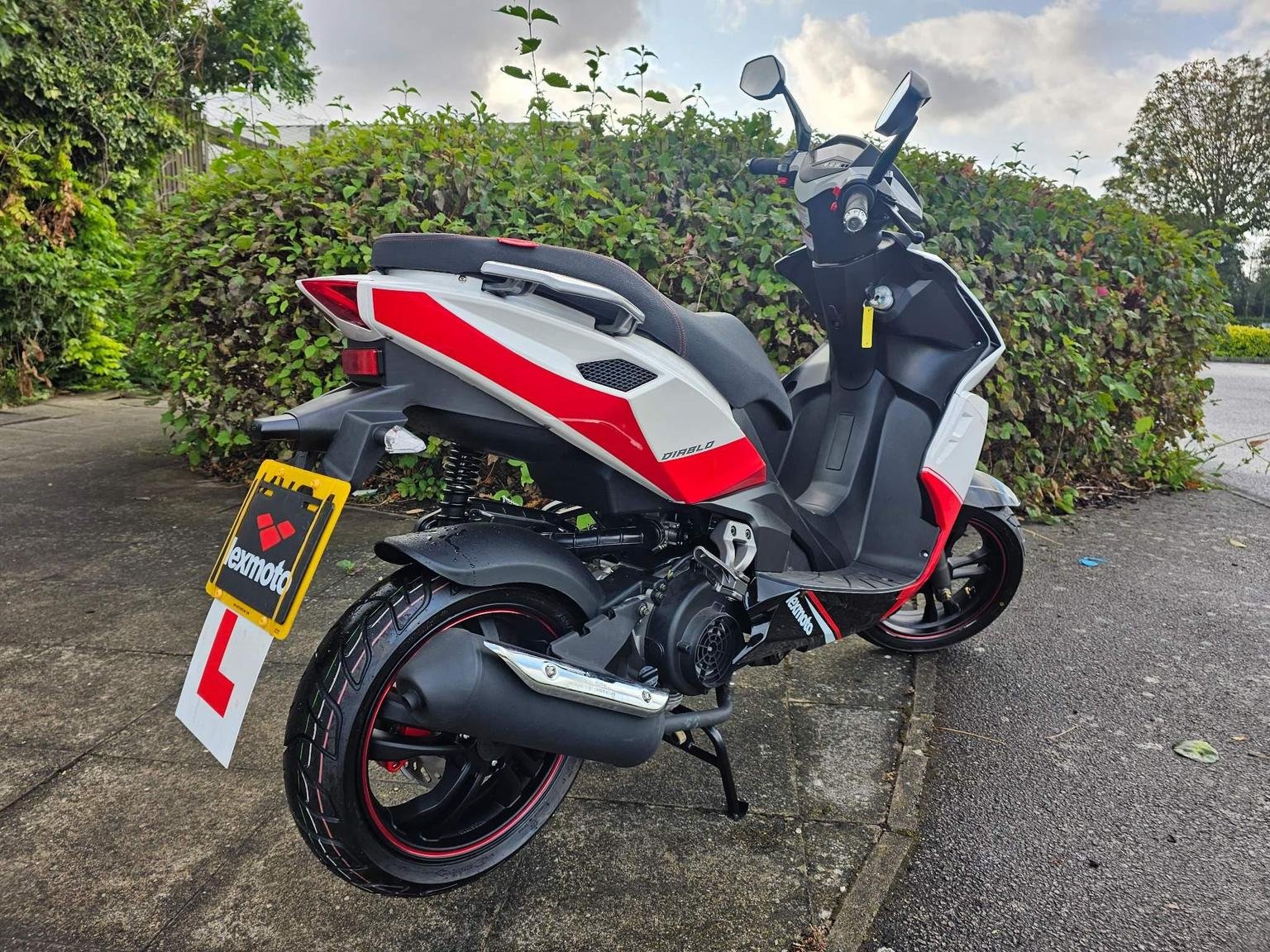 Sharp, sporty styling with an affordable price tag has made the Diablo a go-to choice for all learner legal riders making their own way in life. The racy 4 stroke engine packs a lot punch, and pair that with it`s lightweight frame the Diablo will have you flying off the line. A combined braking system with hydraulic disc brakes front and rear bring you to a safe and controlled stop every time. There`s a digital display and striking LED headlight unit that allows you to ride safely and illuminate the road ahead.
