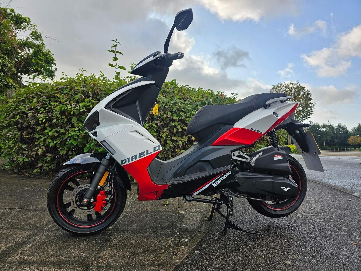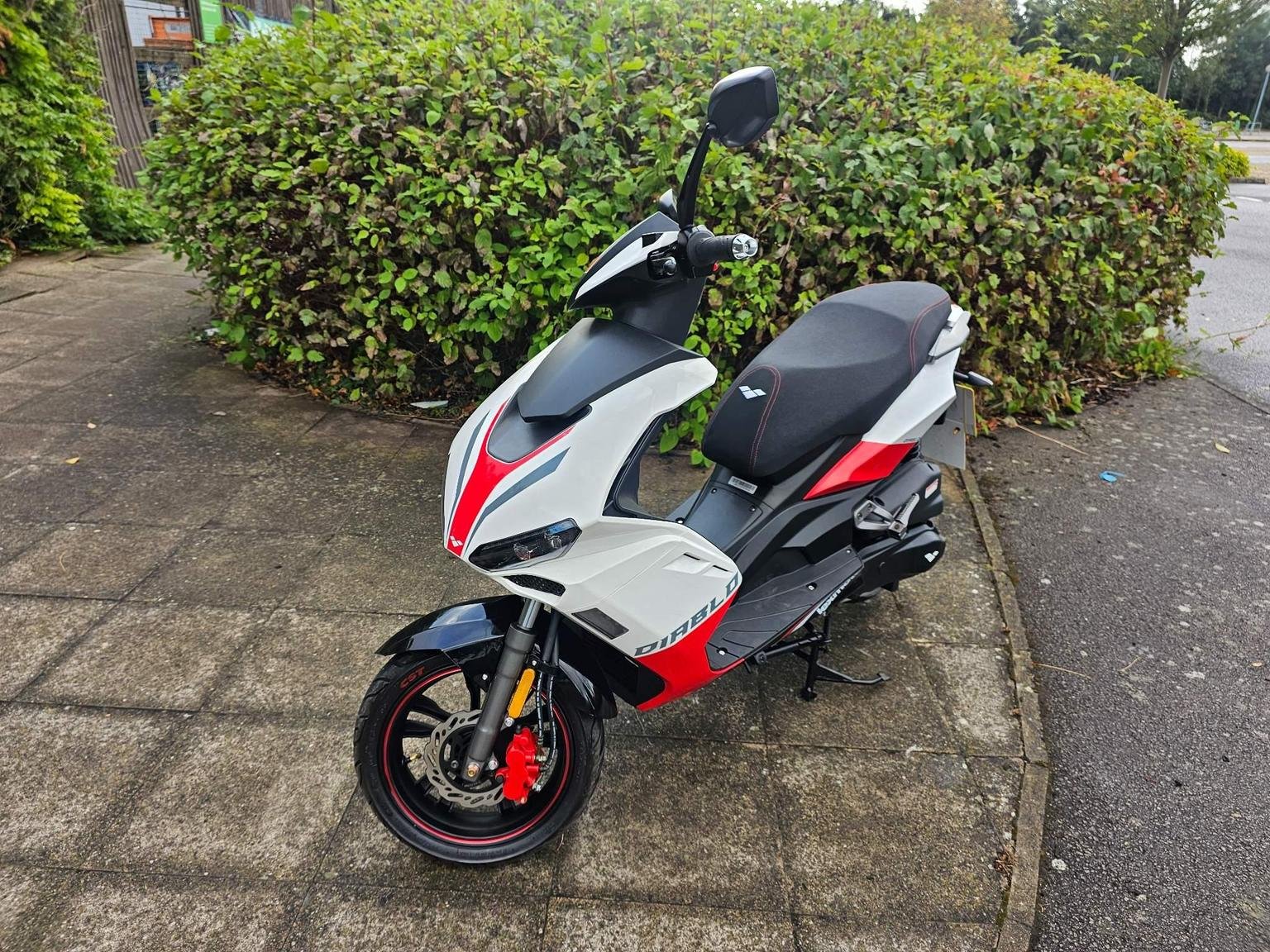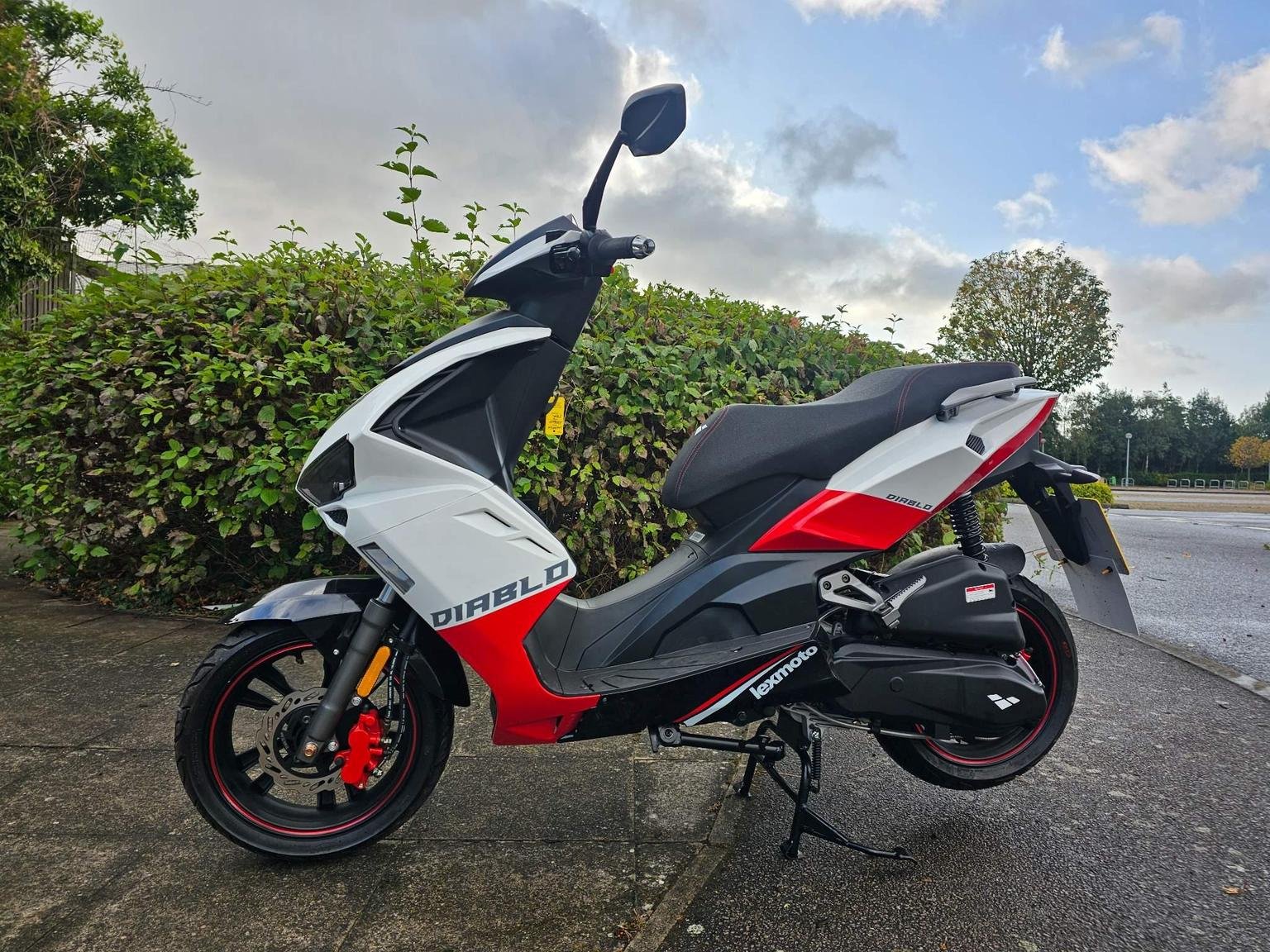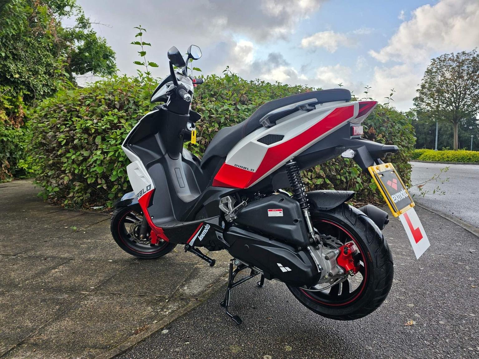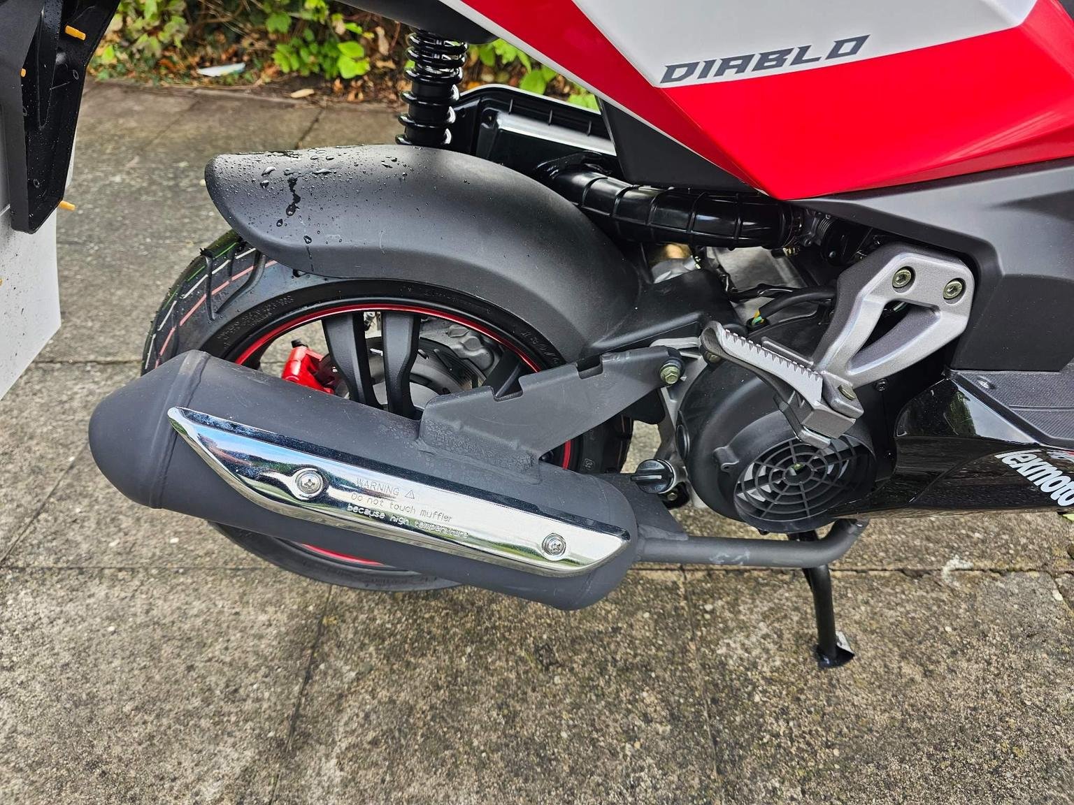 Sharp, sporty styling with an affordable price tag has made the Diablo a go-to choice for all learner legal riders making their own way in life. The racy 4 stroke engine packs a lot punch, and pair that with it`s lightweight frame the Diablo will have you flying off the line. A combined braking system with hydraulic disc brakes front and rear bring you to a safe and controlled stop every time. There`s a digital display and striking LED headlight unit that allows you to ride safely and illuminate the road ahead.